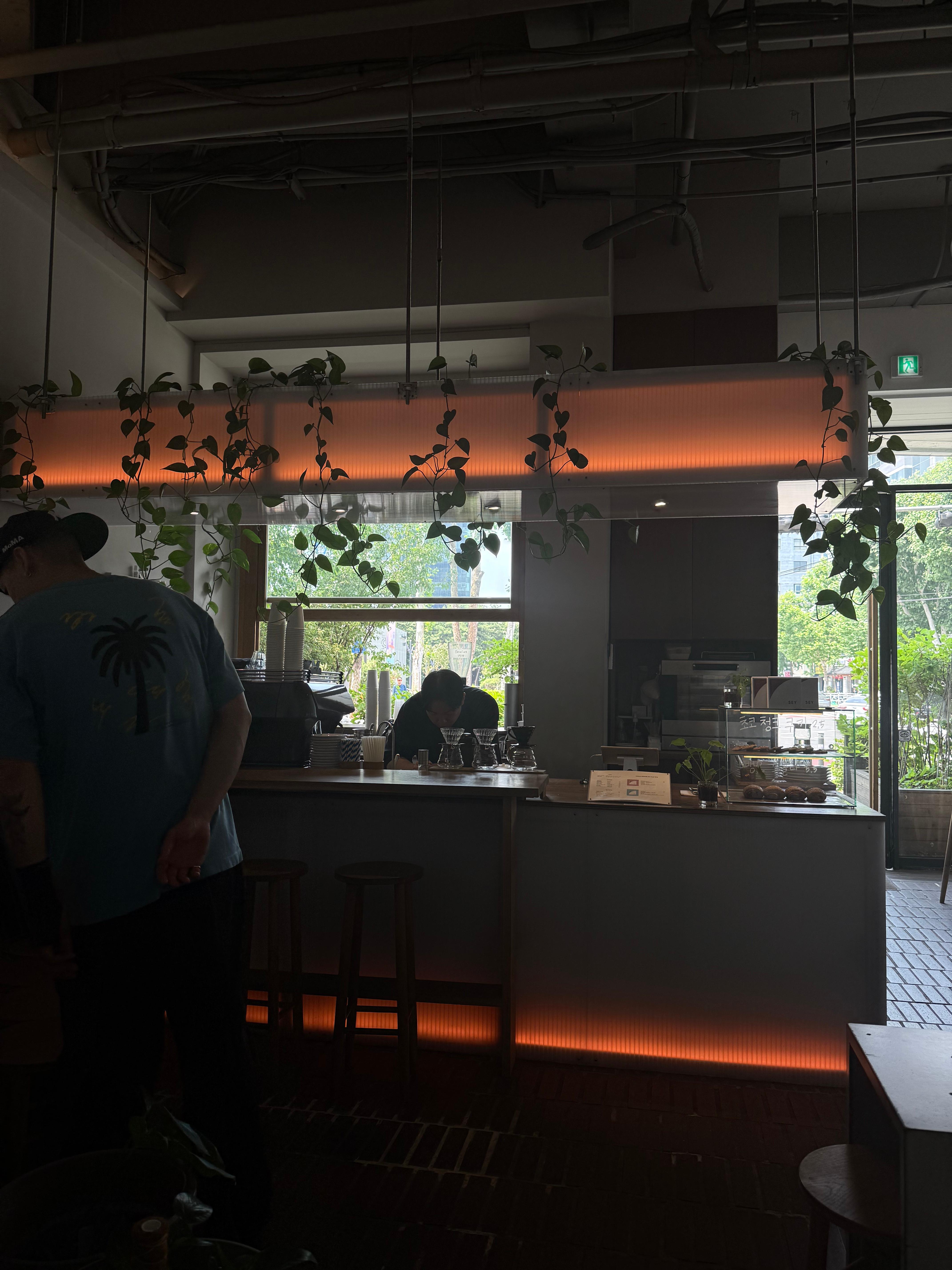 문을 열기 전부터 이미 공간이 말을 걸어온다. 가게 전면을 감싼 목재 화단에는 계절마다 표정이 달라지는 식물들이 자라고, 내부로 들어서면 천장에서 포토스 줄기가 길게 흘러내린다. 조명등을 감싸고 내려오는 초록 덩굴이 이 카페의 시그니처 풍경이다.