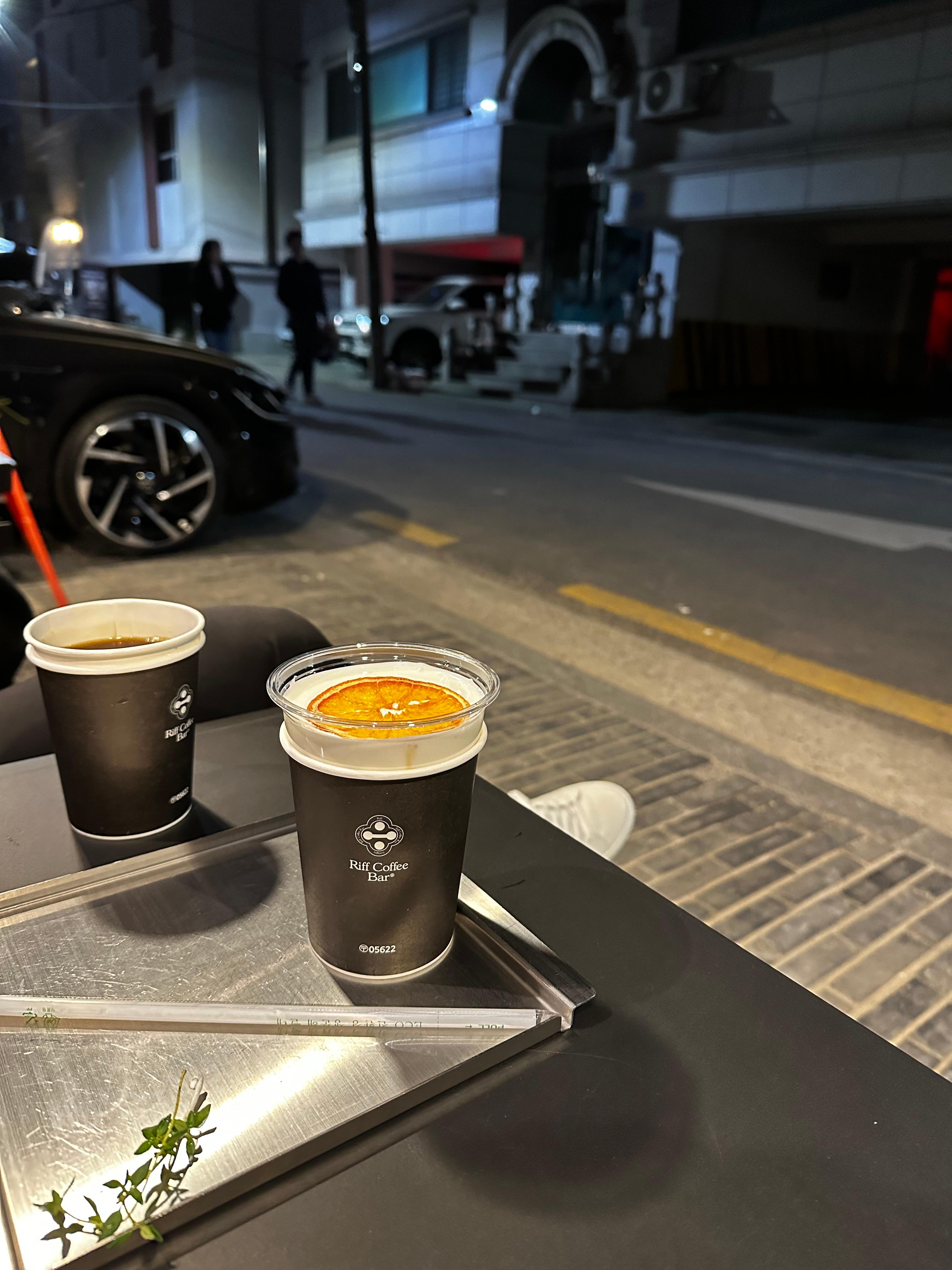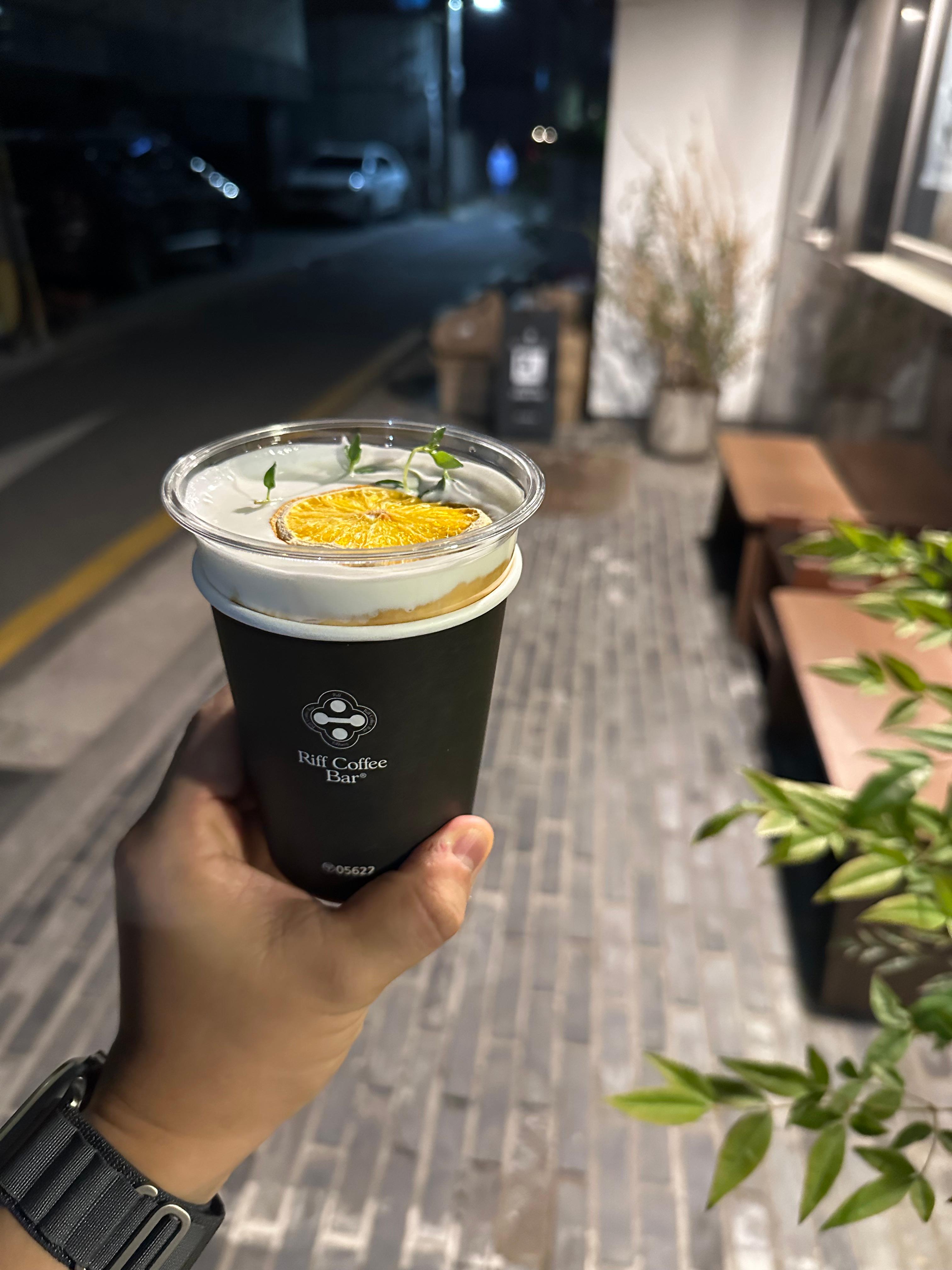 시그니처인 리프커피를 주문했다. 검은 컵 위로 흰 크림이 층을 이루고, 건조 오렌지 슬라이스와 허브가 올라오는 비주얼은 사진 찍기 전에 마시기 미안한 수준이다.