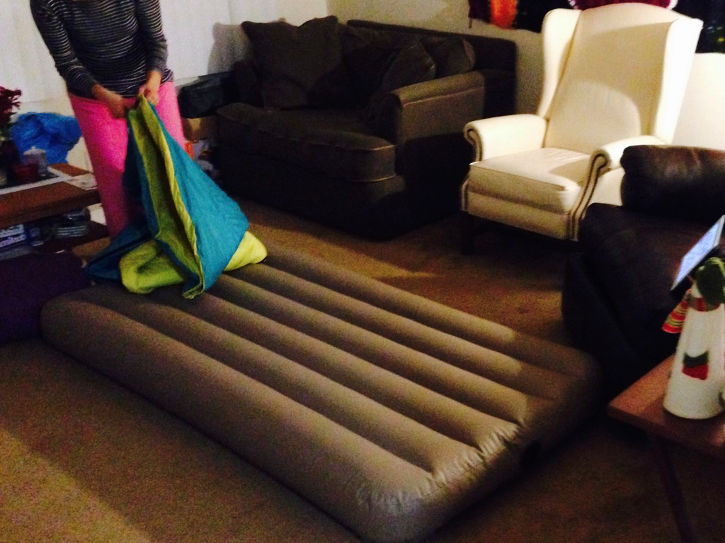 이렇게 밤이 되었어요. 저 자라고 자리를 만들어줬는데요... ^-^ 잘 곳이 없어서 저거를 불어서 만든다음에 깔고 자리를 만들었습니다.