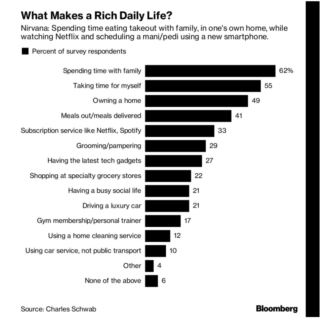 종합적으로 미국 사람들은 스트레스에서 자유하며 사랑하는 사람들( 친구들과 가족)과 함께 살아가는게 부의 기준이라고 말합니다.
